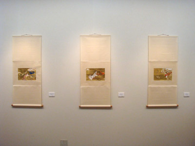 「円座 enza」、「行火 anka」 、「若紫 wakamurasaki」 (エッチング、グワッシュ、純金箔/和紙 掛け軸)。金箔の上に銅板画を刷るという技法に初挑戦した作品です。是非ご覧ください。