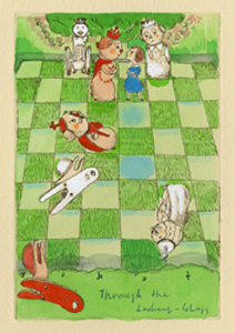 テーマは山本容子が1994年から描きはじめたルイス・キャロル作『不思議の国のアリス』の続編『鏡の国のアリス』です。この物語では、アリスはチェスというゲームのルールに則って「鏡の国」で自分を発見する旅に出ます。考えてみると鏡というのは、薄い平面なのに奥行きをもっている不思議な空間です。