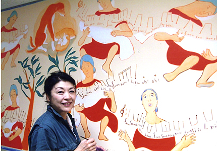 4月26日(金)JR大阪駅北側に新しく誕生する「グランドフロント大阪・ナレッジキャピタル」6階にロート製薬株式会社「Smart Camp(スマートキャンプ)うめきた」がオープンします。人と未来に美と健康を繁くパワースポットが誕生!レストラン「旬穀旬彩」(フレンチの巨匠三國清三シェフプロデュースのフレンチとロートオリジナル家庭薬膳料理のコラボレーションが実現)、隣接する都会型野菜農園、完全無農薬のセラミック栽培。さらにリラクゼーションサロン「HOLISTIC LABホリスティクラボ」では、健康管理のサポートを目的にトータルヘルスビューティを提供。山本は、都会型野菜農園ブースに「緩やかな対話」をテーマに壁画を制作しました。制作風景や完成写真をご覧ください。