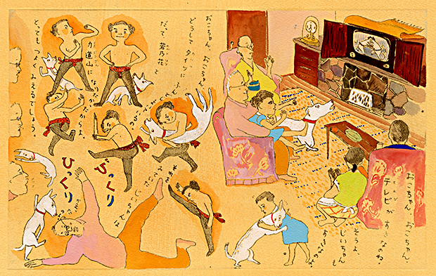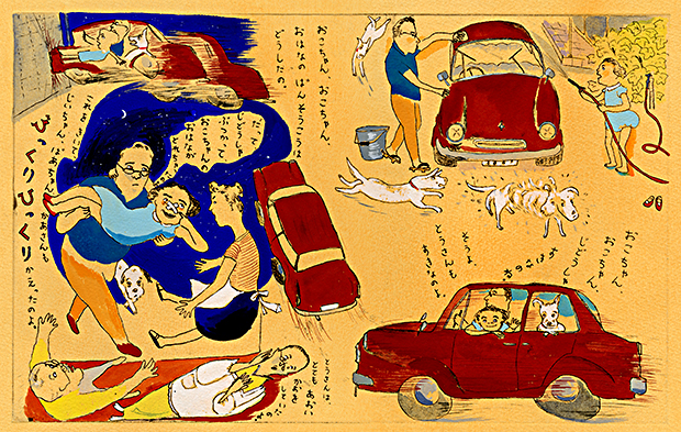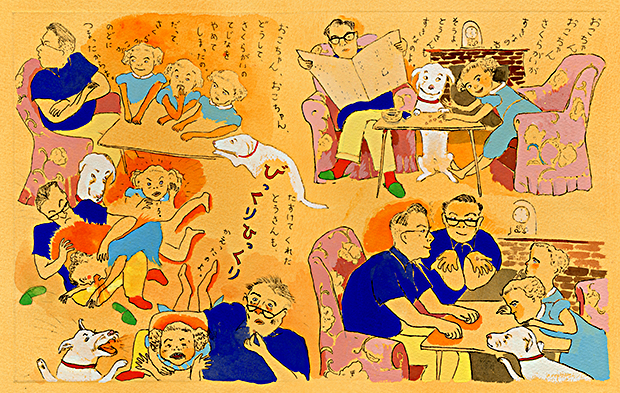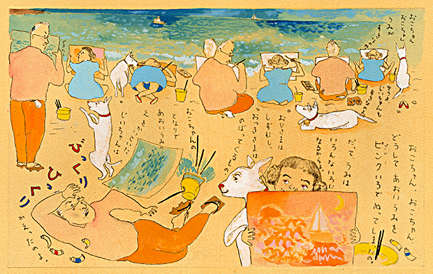 絵本の表紙裏のこの絵は「またねー。元気でねー。」のおこちゃんの声です。
