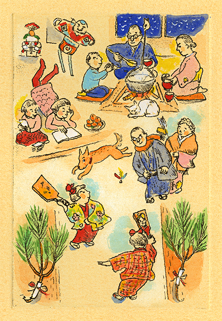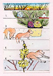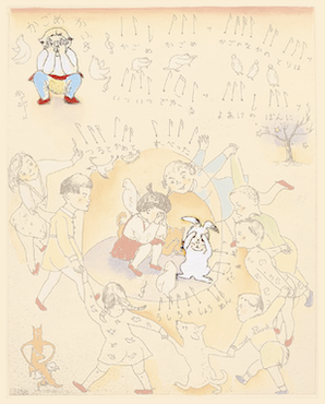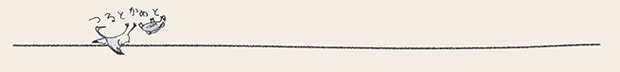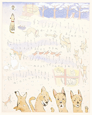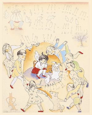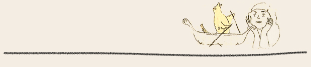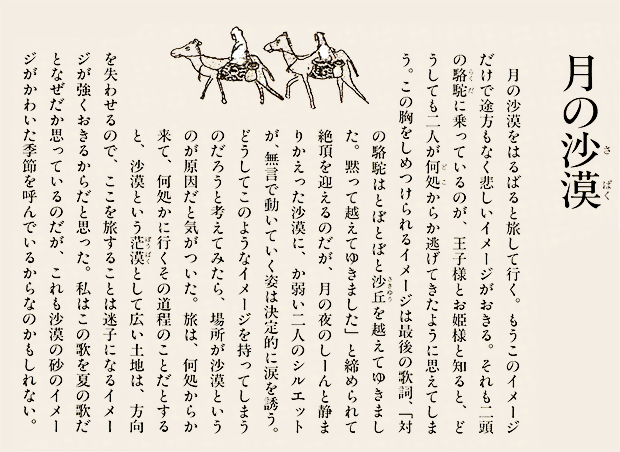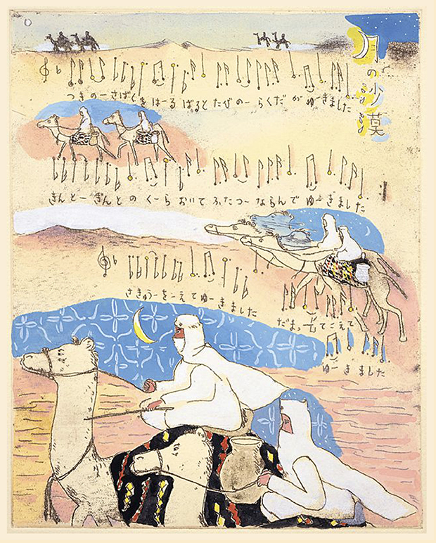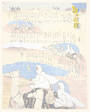 沙漠という茫漠とした風景をイメージしようとすると、まず私の脳裡に浮かぶのは、映画『アラビアのロレンス』(1962)だ。ブルーのオアシスには、イスラム風の幾何学模様を描き込んでみた。タイトル文字は「月の沙漠」だから月(※左)にした。駱駝(らくだ)には、かつてパキスタンのカラチへ行った折、アラビア海の海べりで乗ったことがある。その時、初めて駱駝の移動のスピードを知った。とても脚が長いから、一歩の歩幅も大きい。わずか一歩で、馬と比べると倍ぐらい前進するのだ。その駱駝に乗った時の体感速度(※右)も、この絵の中で表現している。