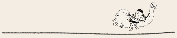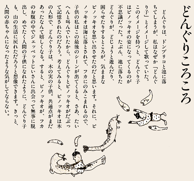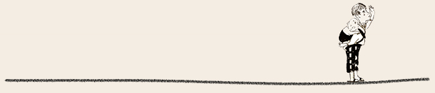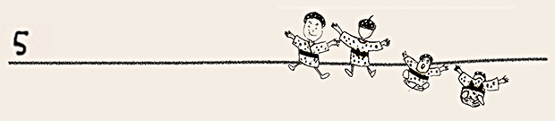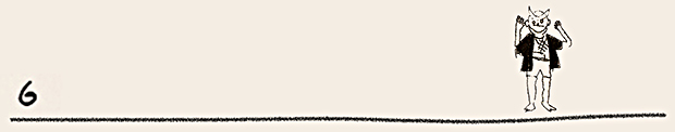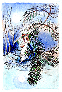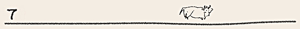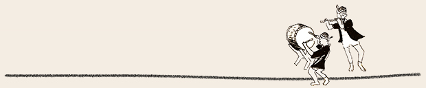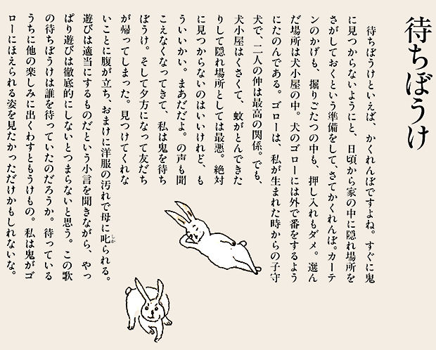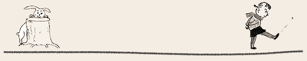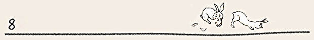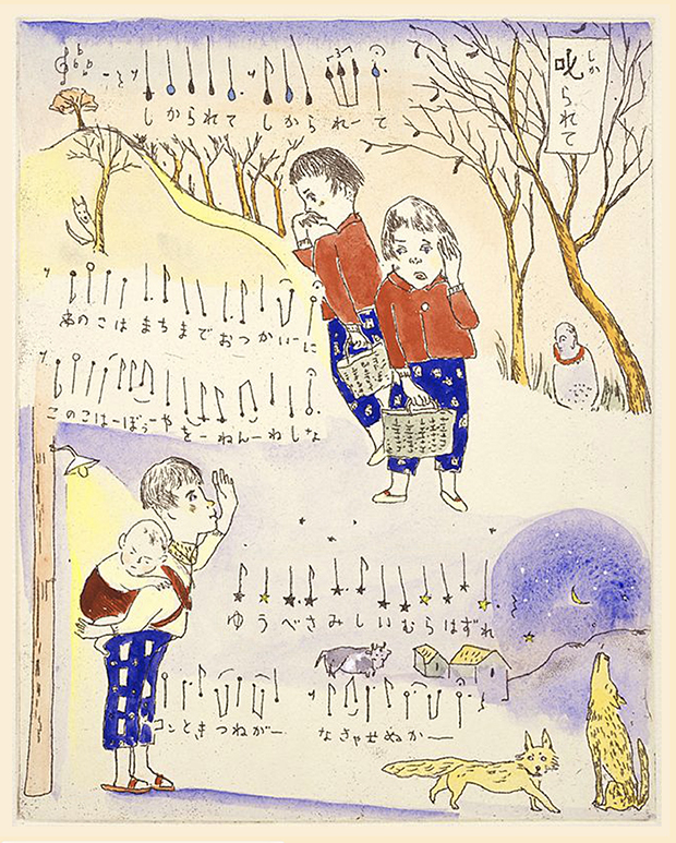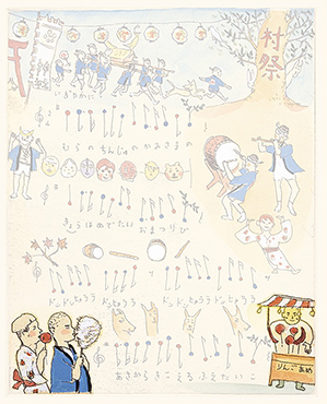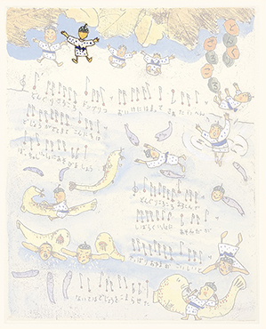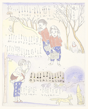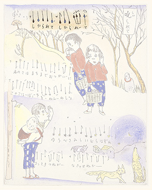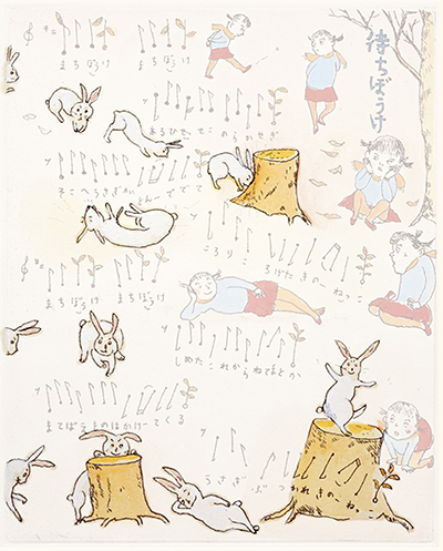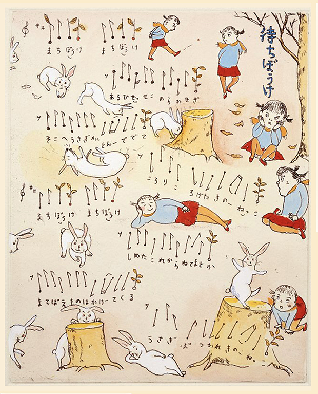 ここでは、ぜひ兎の動きを連続で見ていただきたい。初めの♪まちぼうけ まちぼうけ…… で、兎はうっかり飛んで出てきたばかりに「ころりころげた木のねっこ」だった。ところが、2度目の♪まちぼうけ まちぼうけ…… では、兎はもう学習していて、ぶつかるのがわかっているから、ぶつかると見せかけて、余裕で寝転んでウインクしたり、いくら少女が♪うさぎぶつかれ木のねっこ と見ていても、ねっこの上にひょいと乗っかったり。歌詞から兎を賢い存在としてとらえ直し、絵にしたもの。音符のところどころに「荒野の箒草」のような枯葉がついている。