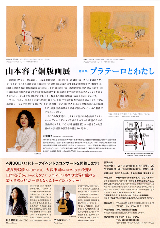 「【特別企画展】山本容子銅版画展 詩画集プラテーロとわたし(サクラアートミュージアム)」の会期中に開催されるトークイベント&コンサートの事前申込受付が本日から開始です!