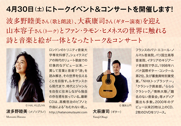 山本容子(トーク)、波多野睦美(歌と朗読)、大萩康司(ギター)による〈詩と音楽と絵〉が一体となった素晴らしい詩画集の世界をご堪能下さい。