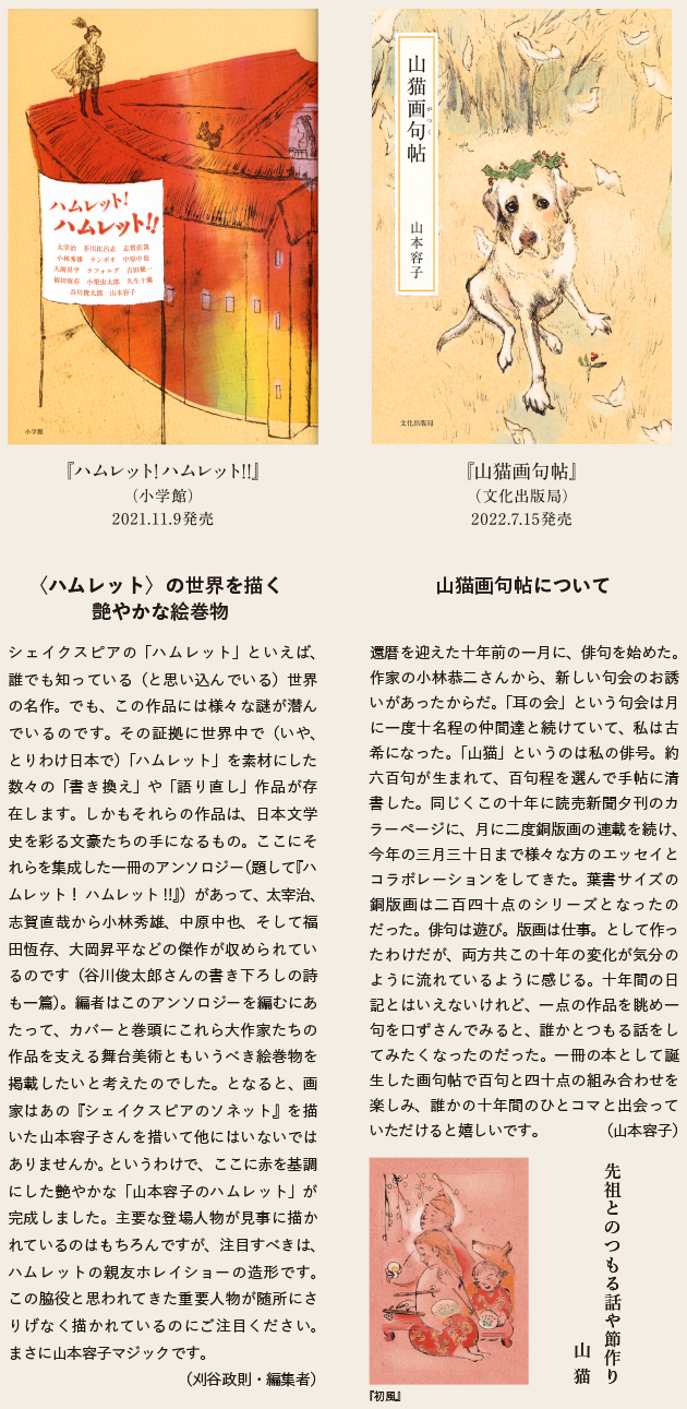 シェイクスピアの「ハムレット」といえば、誰でも知っている(と思い込んでいる)世界の名作。でも、この作品には様々な謎が潜んでいるのです。その証拠に世界中で(いや、とりわけ日本で)「ハムレット」を素材にした数々の「書き換え」や「語り直し」作品が存在します。しかもそれらの作品は、日本文学史を彩る文豪たちの手になるもの。ここにそれらを集成した一冊のアンソロジー(題して『ハムレット! ハムレット!!』)があって、太宰治、志賀直哉から小林秀雄、中原中也、そして福田恆存、大岡昇平などの傑作が収められているのです(谷川俊太郎さんの書き下ろしの詩も一篇)。編者はこのアンソロジーを編むにあたって、カバーと巻頭にこれら大作家たちの作品を支える舞台美術ともいうべき絵巻物を掲載したいと考えたのでした。となると、画家はあの『シェイクスピアのソネット』を描いた山本容子さんを措いて他にはいないではありませんか。