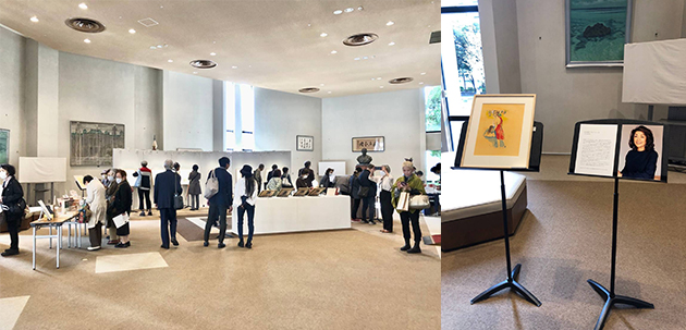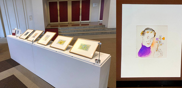 「花のレクイエム」から、5点の花の銅版画と本。辻邦生さんの肖像画。30年前に銅版画で描きました。