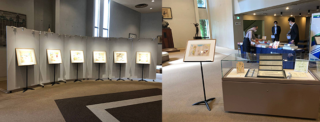 講演会場前のエントランスホールで展覧会をしました。楽譜立てを使って軽やかな展示空間になりました。