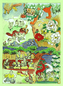 「嗜み」(文藝春秋企画出版部、定価800円税込)扉(山本容子ギャラリー)に、新テーマ「歌舞伎」を連載中。2013年19号(3月25日発売)のテーマは「連獅子」です。