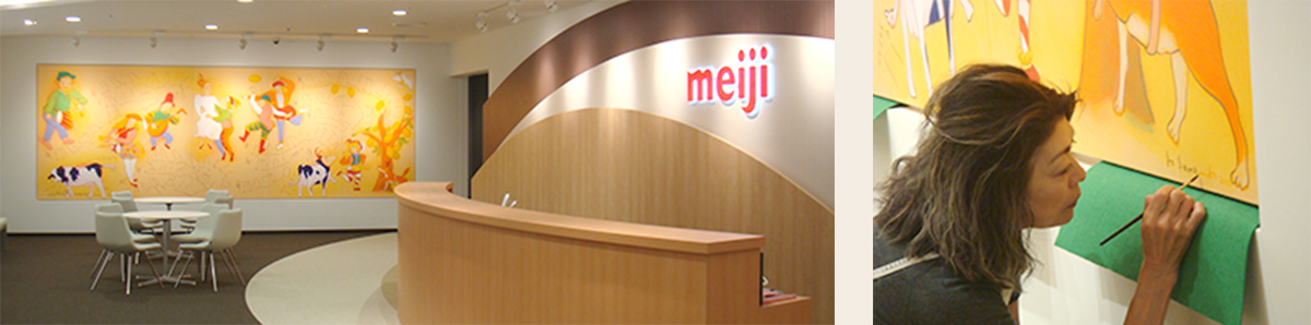 株式会社明治 本社9階エントランス壁画 《パティパタパン》 アクリル、キャンバス 縦1939×横5605mm